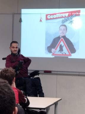 Humoriste, bourbonnais, talentueux et tétraplégique ; Geoffrey rencontre tous les élèves des classes de 5ème dans le cadre d'un projet sur le respect et l'éducation à la différence. Pendant ces échanges organisés par Mme Nancey (CPE), l'artiste présente son métier et son parcours : un accident grave, une enfance particulière, un moral étonnant, une ambition forte...Au fil des années, c'est l'esprit de dérision et d'auto-dérision qui a guidé Geoffrey. Résultat, il propose aujourd'hui ses spectacles dans plusieurs salles locales ou plus éloignées.